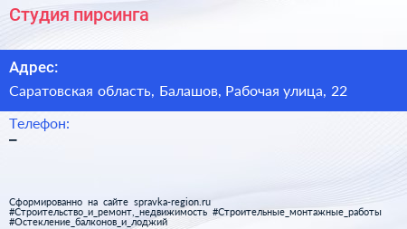 Студия пирсинга по адресу Саратовская область, Балашов, Рабочая улица, 22 в дальнейшем Организация, размещена в следующих категориях: