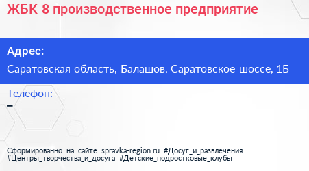 ЖБК-8, производственное предприятие по адресу Саратовская область, Балашов, Саратовское шоссе, 1Б в дальнейшем Организация, размещена в следующих категориях: