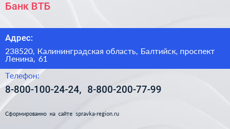 Банк ВТБ по адресу 238520, Калининградская область, Балтийск, проспект Ленина, 61 в дальнейшем Организация, размещена в следующих категориях: