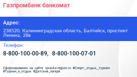 Газпромбанк, банкомат по адресу 238520, Калининградская область, Балтийск, проспект Ленина, 28в в дальнейшем Организация, размещена в следующих категориях: