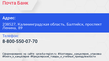 Почта Банк по адресу 238527, Калининградская область, Балтийск, проспект Ленина, 89 в дальнейшем Организация, размещена в следующих категориях: