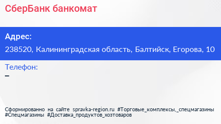 СберБанк, банкомат по адресу 238520, Калининградская область, Балтийск, Егорова, 10 в дальнейшем Организация, размещена в следующих категориях: