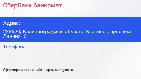 СберБанк, банкомат по адресу 238520, Калининградская область, Балтийск, проспект Ленина, 6 в дальнейшем Организация, размещена в следующих категориях: