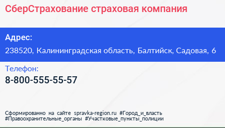 СберСтрахование, страховая компания по адресу 238520, Калининградская область, Балтийск, Садовая, 6 в дальнейшем Организация, размещена в следующих категориях:
