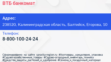 ВТБ, банкомат по адресу 238520, Калининградская область, Балтийск, Егорова, 10 в дальнейшем Организация, размещена в следующих категориях: