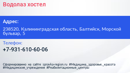 Водолаз, хостел по адресу 238520, Калининградская область, Балтийск, Морской бульвар, 5 в дальнейшем Организация, размещена в следующих категориях: