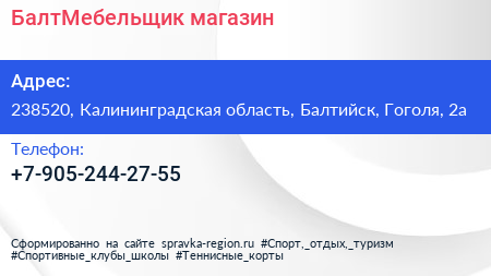 БалтМебельщик, магазин по адресу 238520, Калининградская область, Балтийск, Гоголя, 2а в дальнейшем Организация, размещена в следующих категориях: