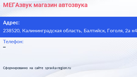 МЕГАзвук, магазин автозвука по адресу 238520, Калининградская область, Балтийск, Гоголя, 2а к4 в дальнейшем Организация, размещена в следующих категориях: