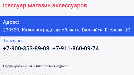 iсессуар, магазин аксессуаров по адресу 238520, Калининградская область, Балтийск, Егорова, 10 в дальнейшем Организация, размещена в следующих категориях: