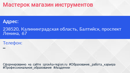 Мастерок, магазин инструментов по адресу 238520, Калининградская область, Балтийск, проспект Ленина, 67 в дальнейшем Организация, размещена в следующих категориях: