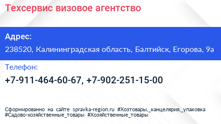 Техсервис, визовое агентство по адресу 238520, Калининградская область, Балтийск, Егорова, 9а в дальнейшем Организация, размещена в следующих категориях: