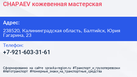 CHAPAEV, кожевенная мастерская по адресу 238520, Калининградская область, Балтийск, Юрия Гагарина, 23 в дальнейшем Организация, размещена в следующих категориях:
