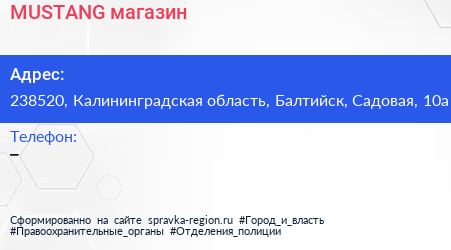 MUSTANG, магазин по адресу 238520, Калининградская область, Балтийск, Садовая, 10а в дальнейшем Организация, размещена в следующих категориях: