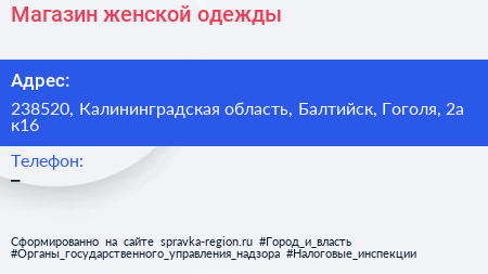 Магазин женской одежды по адресу 238520, Калининградская область, Балтийск, Гоголя, 2а к16 в дальнейшем Организация, размещена в следующих категориях: