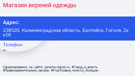 Магазин верхней одежды по адресу 238520, Калининградская область, Балтийск, Гоголя, 2а к18 в дальнейшем Организация, размещена в следующих категориях: