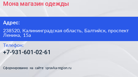 Мона, магазин одежды по адресу 238520, Калининградская область, Балтийск, проспект Ленина, 15а в дальнейшем Организация, размещена в следующих категориях: