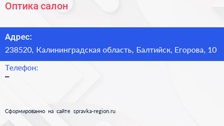 Оптика, салон по адресу 238520, Калининградская область, Балтийск, Егорова, 10 в дальнейшем Организация, размещена в следующих категориях: