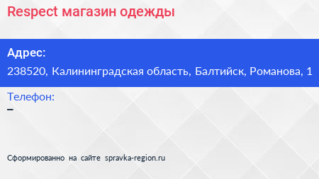 Respect, магазин одежды по адресу 238520, Калининградская область, Балтийск, Романова, 1 в дальнейшем Организация, размещена в следующих категориях:
