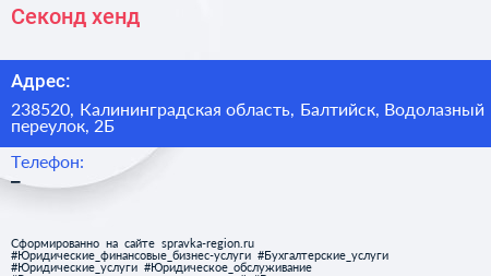 Секонд-хенд по адресу 238520, Калининградская область, Балтийск, Водолазный переулок, 2Б в дальнейшем Организация, размещена в следующих категориях:
