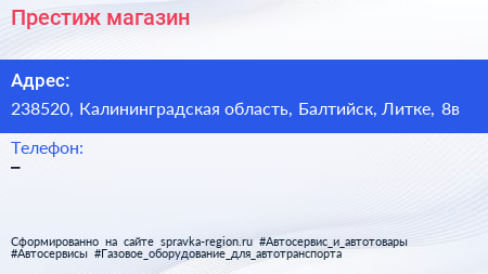 Престиж, магазин по адресу 238520, Калининградская область, Балтийск, Литке, 8в в дальнейшем Организация, размещена в следующих категориях: