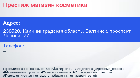 Престиж, магазин косметики по адресу 238520, Калининградская область, Балтийск, проспект Ленина, 77 в дальнейшем Организация, размещена в следующих категориях: