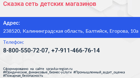 Сказка, сеть детских магазинов по адресу 238520, Калининградская область, Балтийск, Егорова, 10а в дальнейшем Организация, размещена в следующих категориях: