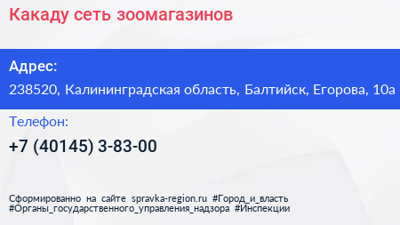 Какаду, сеть зоомагазинов по адресу 238520, Калининградская область, Балтийск, Егорова, 10а в дальнейшем Организация, размещена в следующих категориях: