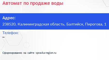 Автомат по продаже воды по адресу 238520, Калининградская область, Балтийск, Пирогова, 1 в дальнейшем Организация, размещена в следующих категориях: