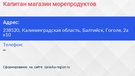 Капитан, магазин морепродуктов по адресу 238520, Калининградская область, Балтийск, Гоголя, 2а к10 в дальнейшем Организация, размещена в следующих категориях: