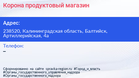 Корона, продуктовый магазин по адресу 238520, Калининградская область, Балтийск, Артиллерийская, 4а в дальнейшем Организация, размещена в следующих категориях: