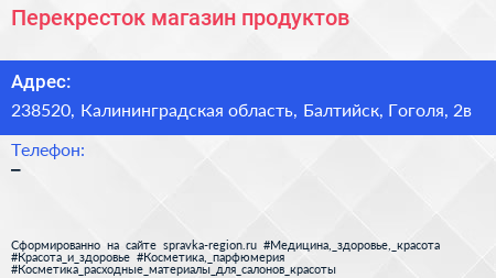 Перекресток, магазин продуктов по адресу 238520, Калининградская область, Балтийск, Гоголя, 2в в дальнейшем Организация, размещена в следующих категориях: