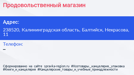 Продовольственный магазин по адресу 238520, Калининградская область, Балтийск, Некрасова, 11 в дальнейшем Организация, размещена в следующих категориях:
