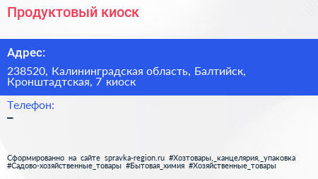 Продуктовый киоск по адресу 238520, Калининградская область, Балтийск, Кронштадтская, 7 киоск в дальнейшем Организация, размещена в следующих категориях: