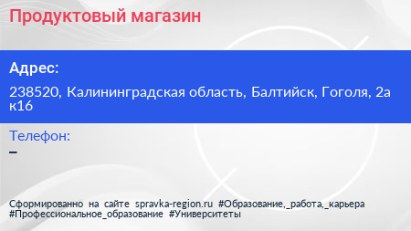 Продуктовый магазин по адресу 238520, Калининградская область, Балтийск, Гоголя, 2а к16 в дальнейшем Организация, размещена в следующих категориях: