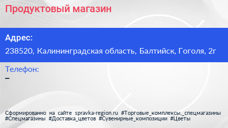 Продуктовый магазин по адресу 238520, Калининградская область, Балтийск, Гоголя, 2г в дальнейшем Организация, размещена в следующих категориях: