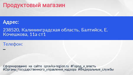 Продуктовый магазин по адресу 238520, Калининградская область, Балтийск, Е. Кочешкова, 11а ст1 в дальнейшем Организация, размещена в следующих категориях: