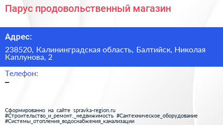 Парус, продовольственный магазин по адресу 238520, Калининградская область, Балтийск, Николая Каплунова, 2 в дальнейшем Организация, размещена в следующих категориях: