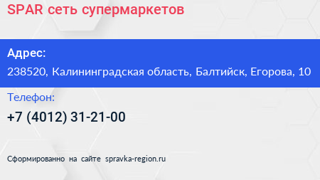 SPAR, сеть супермаркетов по адресу 238520, Калининградская область, Балтийск, Егорова, 10 в дальнейшем Организация, размещена в следующих категориях: