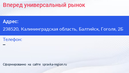 Вперед, универсальный рынок по адресу 238520, Калининградская область, Балтийск, Гоголя, 2Б в дальнейшем Организация, размещена в следующих категориях: