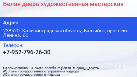Белая дверь, художественная мастерская по адресу 238520, Калининградская область, Балтийск, проспект Ленина, 61 в дальнейшем Организация, размещена в следующих категориях: