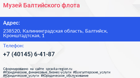 Музей Балтийского флота по адресу 238520, Калининградская область, Балтийск, Кронштадтская, 1 в дальнейшем Организация, размещена в следующих категориях: