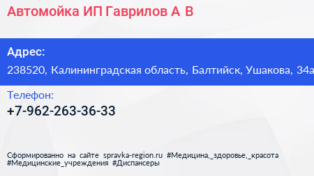 Автомойка, ИП Гаврилов А.В. по адресу 238520, Калининградская область, Балтийск, Ушакова, 34а в дальнейшем Организация, размещена в следующих категориях: