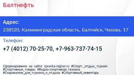Балтнефть по адресу 238520, Калининградская область, Балтийск, Чехова, 17 в дальнейшем Организация, размещена в следующих категориях: