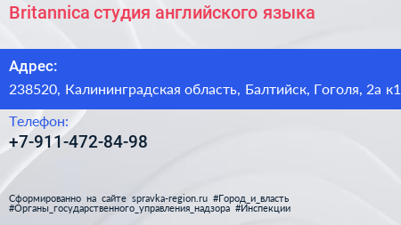 Britannica, студия английского языка по адресу 238520, Калининградская область, Балтийск, Гоголя, 2а к1 в дальнейшем Организация, размещена в следующих категориях: