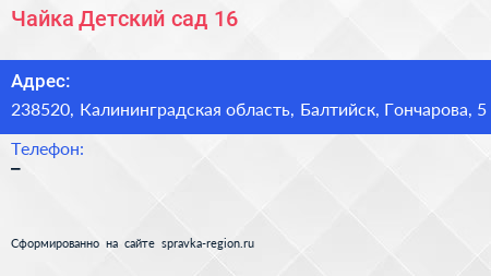 Чайка, Детский сад №16 по адресу 238520, Калининградская область, Балтийск, Гончарова, 5 в дальнейшем Организация, размещена в следующих категориях: