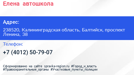 Елена+, автошкола по адресу 238520, Калининградская область, Балтийск, проспект Ленина, 38 в дальнейшем Организация, размещена в следующих категориях: