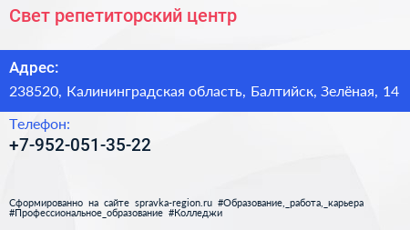 Свет, репетиторский центр по адресу 238520, Калининградская область, Балтийск, Зелёная, 14 в дальнейшем Организация, размещена в следующих категориях:
