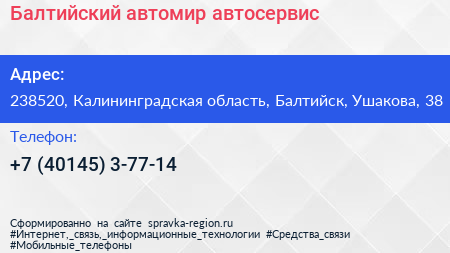 Балтийский автомир, автосервис по адресу 238520, Калининградская область, Балтийск, Ушакова, 38 в дальнейшем Организация, размещена в следующих категориях: