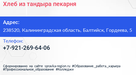 Хлеб из тандыра, пекарня по адресу 238520, Калининградская область, Балтийск, Гордеева, 5 в дальнейшем Организация, размещена в следующих категориях:
