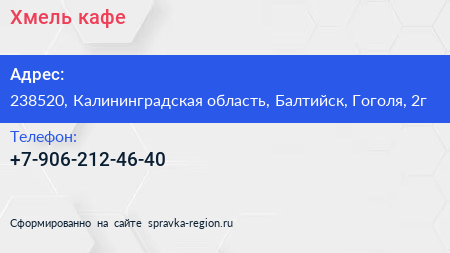 Хмель, кафе по адресу 238520, Калининградская область, Балтийск, Гоголя, 2г в дальнейшем Организация, размещена в следующих категориях: